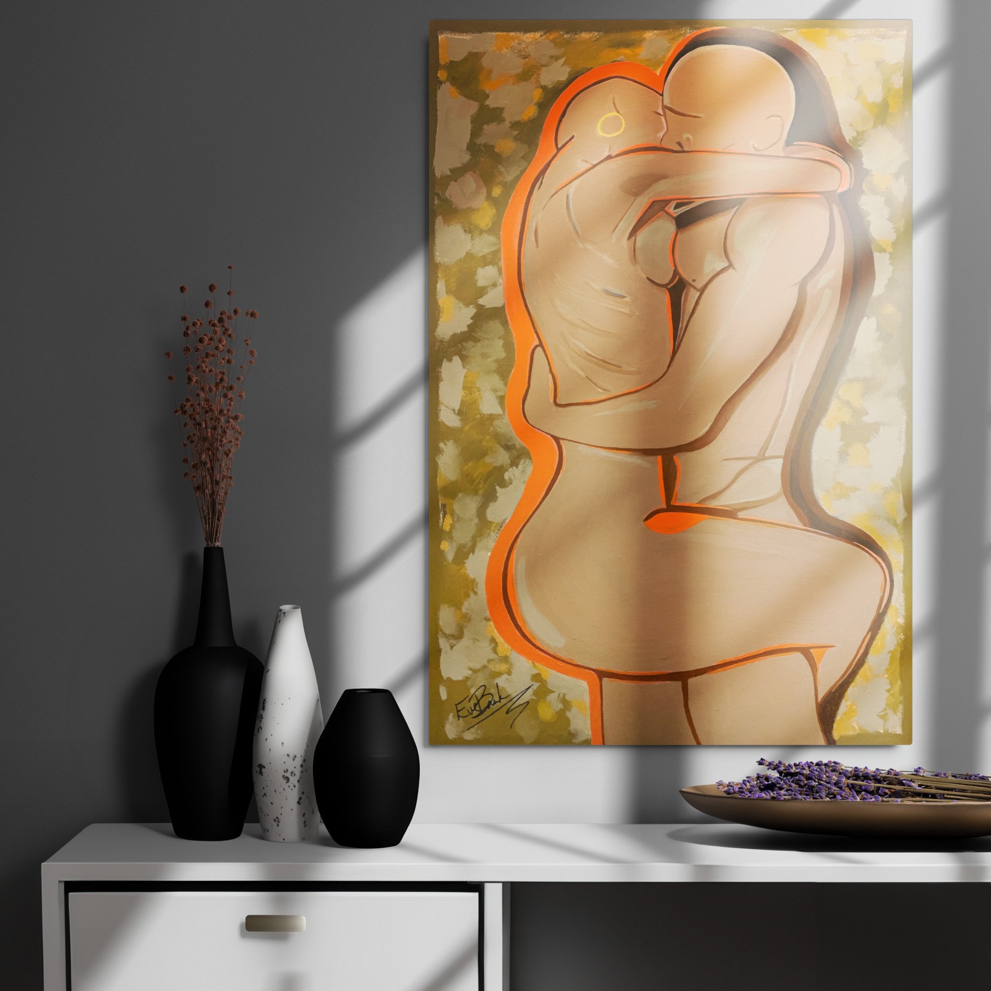 A tender display of intimacy that speaks to the individual power that two people bring together when connecting as one. Divine intimacy. This work of art is great for manifesting the love you want or reflecting on the love you have. This is a 24x36 metal, vivid, fade-resistant print that you're bound to connect with. The wood frame makes it perfect for mounting. This metal, dimensional, and high-quality piece of art stands the test of time while remaining easy to clean and care for. The artwork looks luminescent against the wall, and the metal base means it’ll last a long time. Ready to hang.